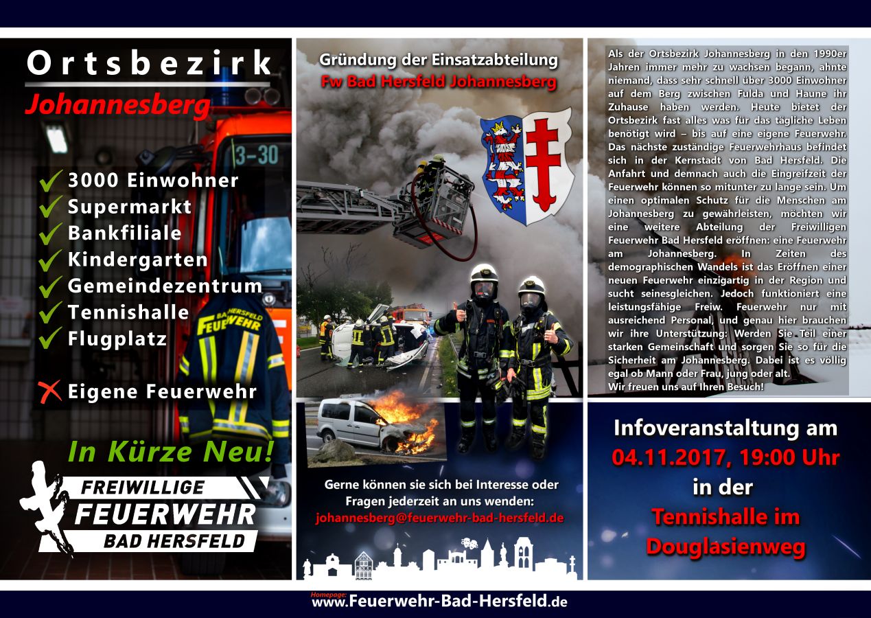Bad Hersfeld Am kommenden Samstag den 04.11.2017 findet um 19 Uhr eine Informationsveranstaltung zur Gründung einer Freiwilligen Feuerwehr im Stadtbezirk Johannesberg statt. Mit über 3000 Einwohner in ca. 1800 Haushalten, einem Einkaufsmarkt, einem Flugplatz und mehreren großen Wohnobjekten ist der Johannesberg einer der größten Ortsbezirke Bad Hersfelds. Das nächste zuständige Feuerwehrhaus befindet sich in der Bad Hersfelder Kernstadt. Die Anfahrt und demnach auch die Eingreifzeit der Feuerwehr können so mitunter zu lange sein. Die gesetzliche Hilfsfrist für Feuerwehren liegt in Hessen bei 10 Minuten. Dies bedeutet, dass innerhalb dieser 10 Minuten (ab dem Zeitpunkt der Alarmierung) mindestens eine Feuerwehrtaktische-Einheit, in