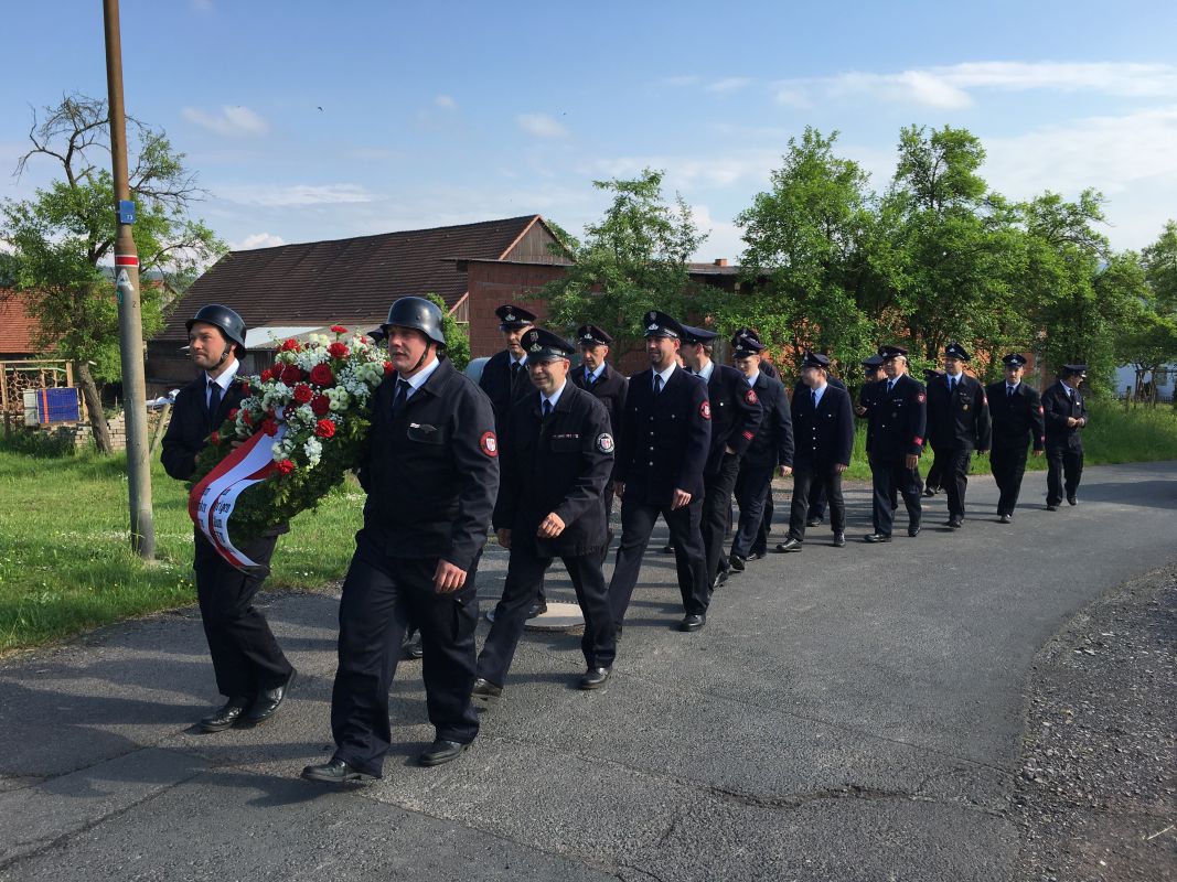 ASBACH. Am letzten Wochenende im Mai waren zahlreiche Besucher nach Asbach gekommen um mit der hiesigen Feuerwehr ihr 90 jähriges Jubiläum im Festzelt am Asbacher Schulhof zu feiern. Es begann am Freitag mit der Kranzniederlegung am Friedhof zu Ehren der verstorbenen Kameraden seit der Gründung in 1926. Daraufhin ging es in das Festzelt zum Festkommers. Hier hatten sich viele Gäste und Ehrengäste aus Politik, Vereinen und Feuerwehr versammelt. Besonders begrüßten Wehrführer Carsten Ullrich und der 1. Vorsitzende des Feuerwehrverein Matthias März die Partnerwehr aus Bad Salzungen sowie eine Abordnung aus der tschechischen Partnerstadt Sumperk. Natürlich standen an diesem Abend auch wieder zahlreiche Ehrungen an. Eine nicht alltägliche Ehrung verlieh der Erste Stadtrat Gunter Grimm an